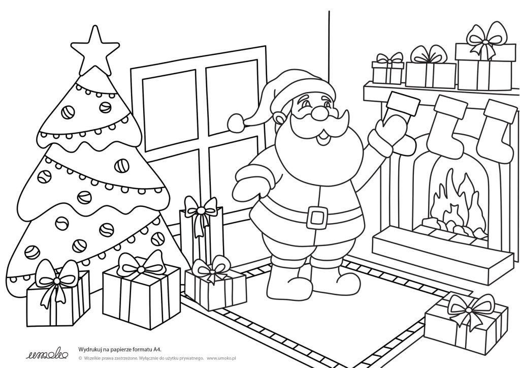 Świąteczna kolorowanka z Mikołajem przy choince