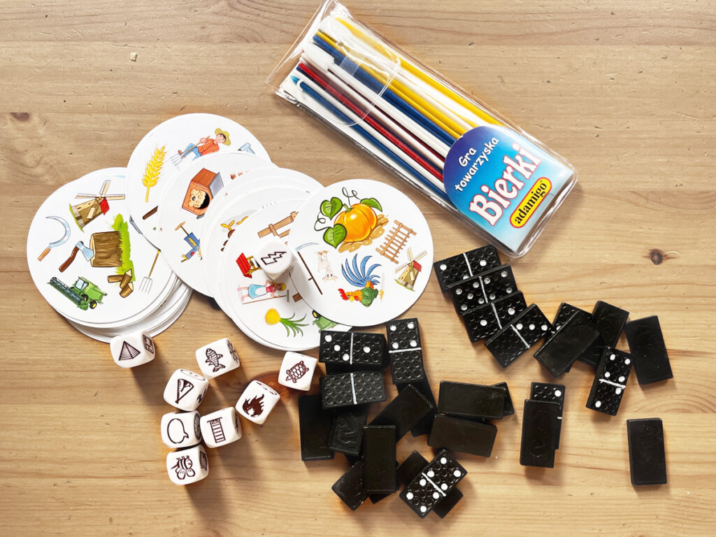 Dziewięć kostek sześciennych z obrazkami na każdej ze ścian. Rzucamy kostkami i na podstawie obrazków, które nam wypadły układamy dowolną historię. Rodzajów kostek i sposobów gier jest bardzo wiele. Więcej na ten temat możecie przeczytać we wpisie Story Cubes – bezcenna inwestycja w mowę i wyobraźnię dziecka. Kostki nie zajmują dużo miejsca w torbie a są świetną zabawą czy to w restauracji podczas czekania na posiłek czy na plaży lub pikniku w parku.