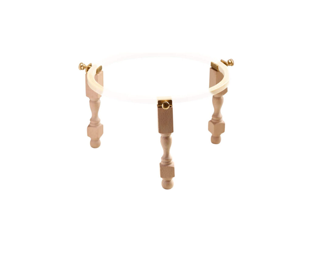 - Nogi do tamborków – Trzy lub cztery nogi, które mocujemy za pomocą śrub do tamborka. Nie testowałam, ale sądzę, że sprawdzi się lepiej przy większych aniżeli mniejszych tamborkach. Może być dobrym rozwiązaniem do haftowania za pomocą punch needle (haft pętelkowy) czy przy szwach przeplatanych.
