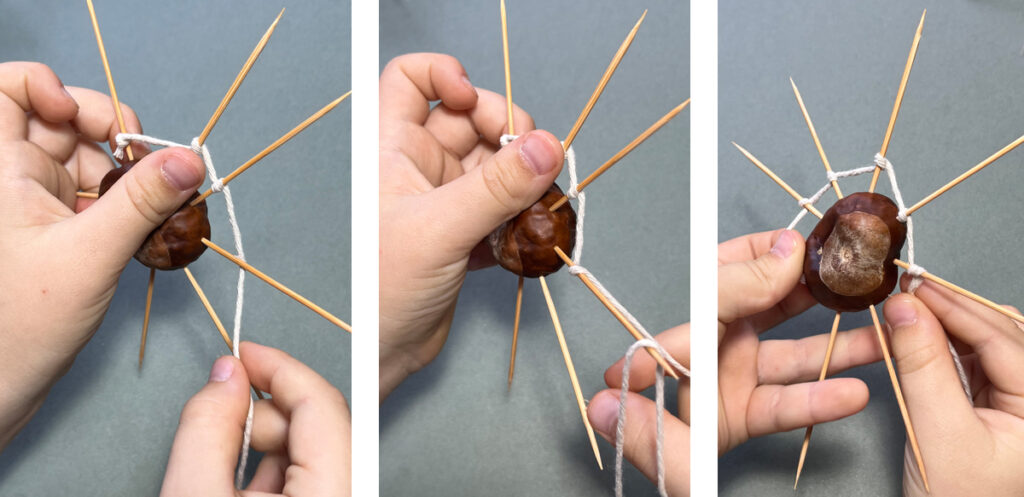 Jeśli chcecie pobawić się w stworzenie gigantycznej pajęczyny, wybierzcie największy kasztan jaki macie i zamiast zwykłych wykałaczek wbijcie wykałaczki do szaszłyków. Owijanie kontynuujcie jak powyrzej.
