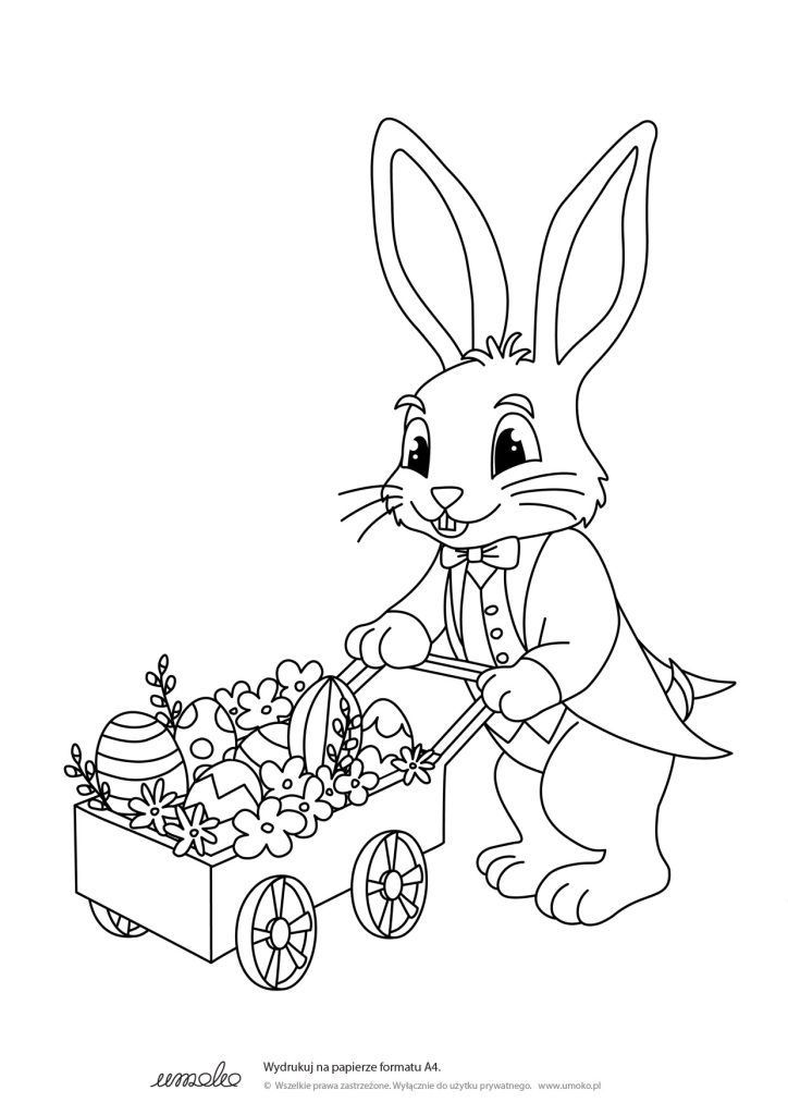 I oto już kolejna darmowa kolorowanka z wielkanocnym królikiem w roli głównej. Tym razem królik osobiście dostarcza komuś taczkę pełną pisanek i wiosennych kwiatów.