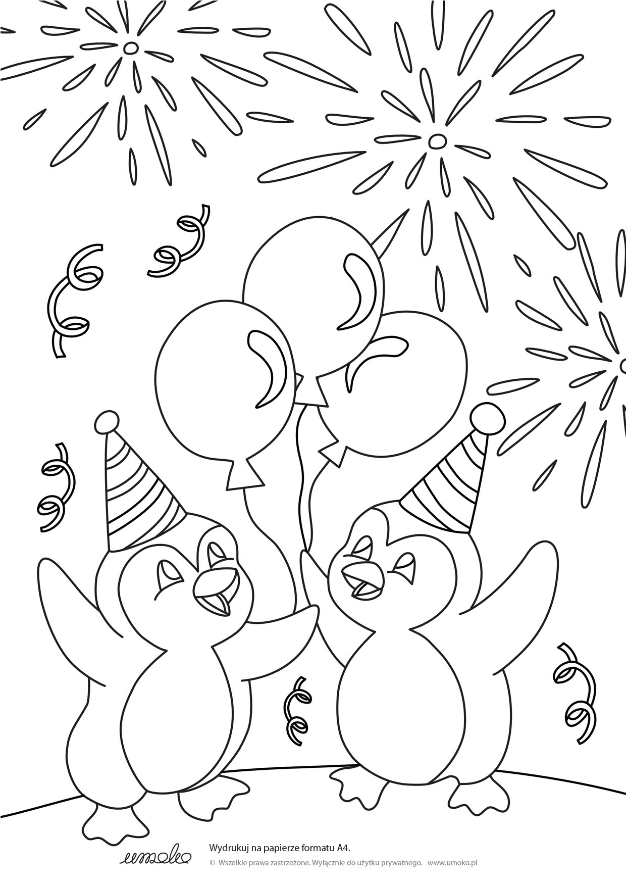 Nowy Rok to świetny moment na wspólną zabawę z dziećmi! W tej kolorowance pingwinki tańczą i świętują, machając balonikami, sypiąc konfetti i przyglądając się fajerwerkom. To zimowa radość, którą możecie wspólnie z dziećmi pokolorwać w sylwestra lub Nowy Rok.