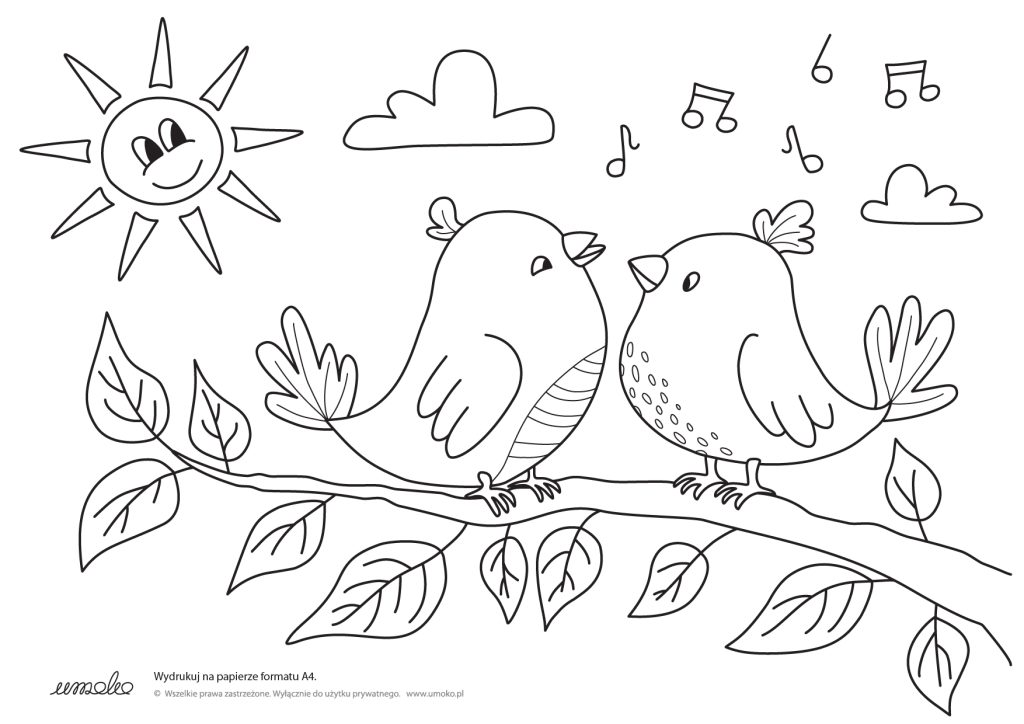 Ptaszki ćwierkają, bo czują, że wiosna już blisko. Pokolorujcie tę radosną scenkę i powitajcie razem cieplejsze dni.
