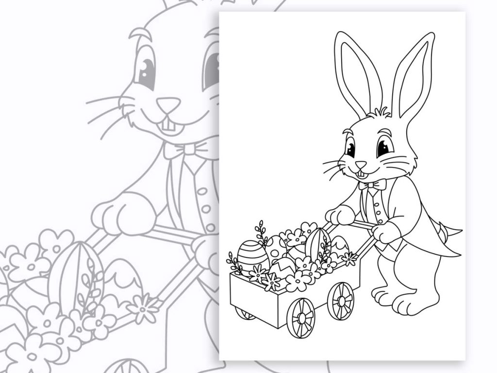 kolorowanka: królik wielkanocny z taczką pełną pisanek